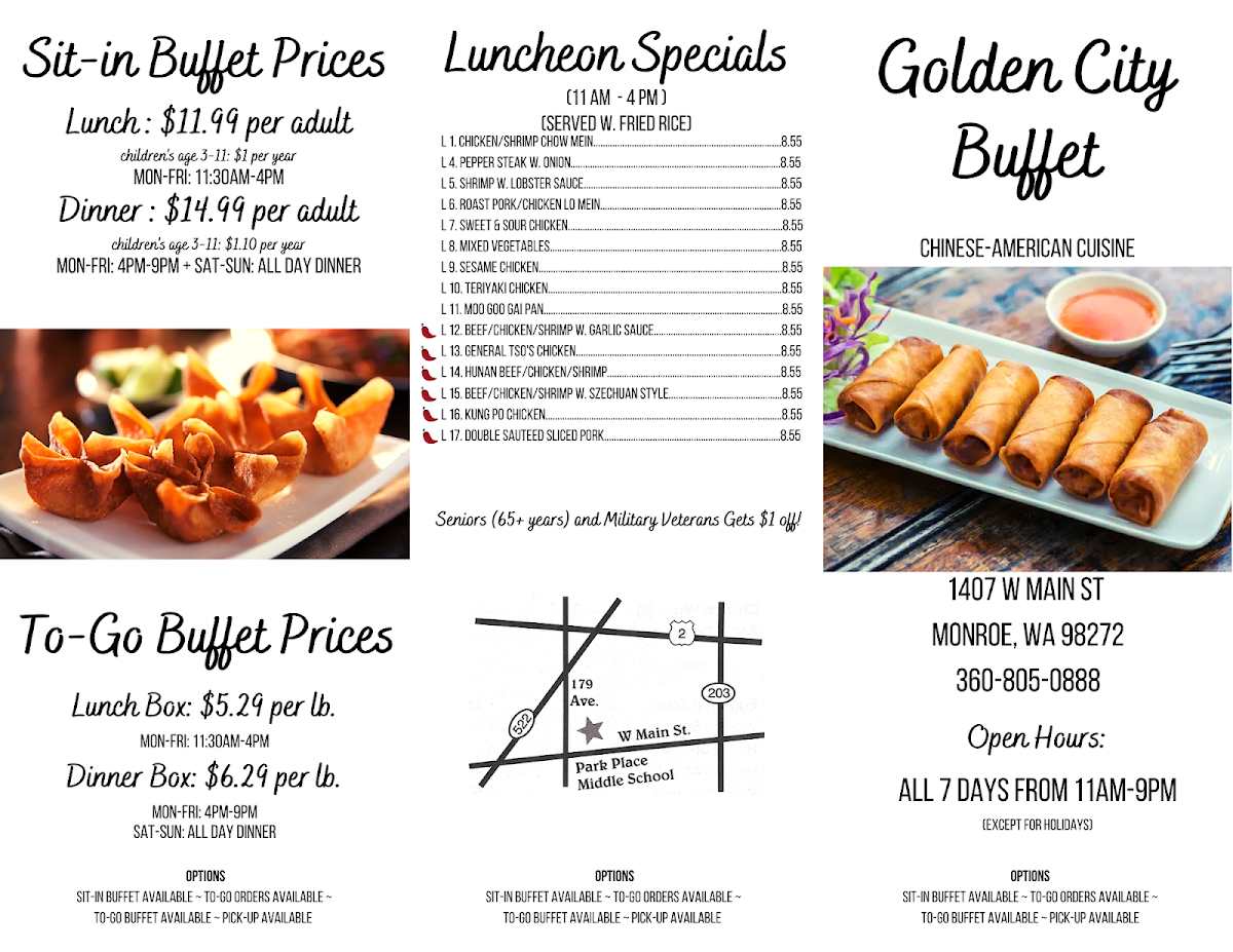 Welcome to Golden City Buffet, where deliciousness meets affordability! Nestled in Monroe, WA, this buffet is celebrated for its variety and warm atmosphere. With an emphasis on value, guests can indulge in an all-you-can-eat experience for just $15, which attracts both locals and travelers alike.